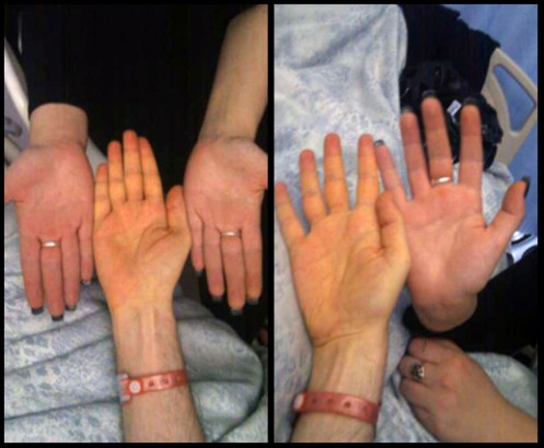 Being in hospital was really difficult. A lot of the staff didn’t understand severe ME/CFS at all, but some were good to me. Because most tests were relatively normal, some of them even seemed to be kind of angry with me, which was very hard & frustrating.. being this weak and unwell. I guess they were frustrated too though. Not sure how they didn’t find much, even with the obvious external signs that something is very wrong, such as the obvious extreme weakness, rashes, very pale strange skin tone (see my hands next to my ex’s normal ones), constant colds/flu & so on.